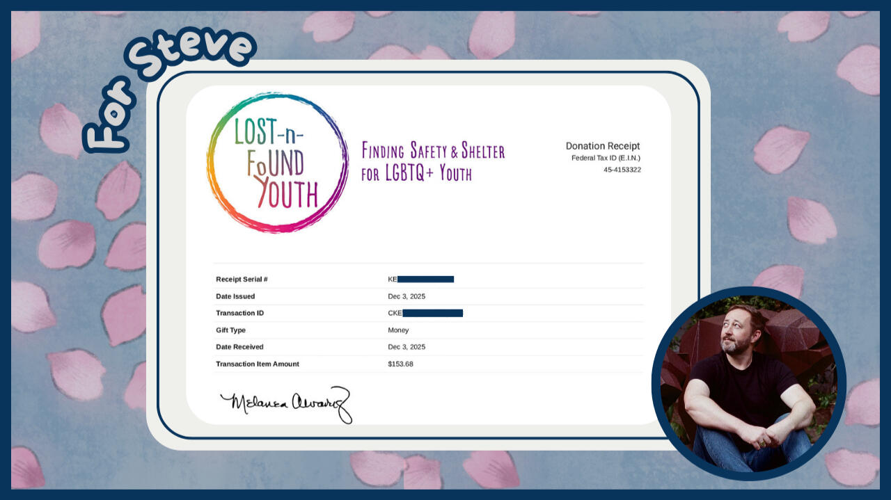 Finally, Uplifts donated $150.00 to the Atlanta LGBTQIA+ nonprofit Lost-n-Found Youth in December of 2025 to honor our showrunner, Steve Yockey, on his birthday.